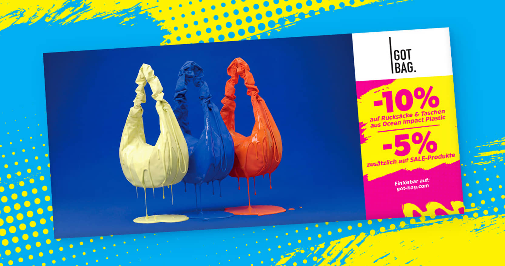 5% Ersparnis 3 weitere GutscheineDoppelt sparen – mit Stil und Verantwortung: Bei GOT BAG gibt's Rucksäcke, Taschen u.v.m. aus recyceltem Ocean Impact Plastic und mit unserem Studentenrabatt aus dem neuen Gutscheinheft holst du dir 5% Nachlass auf den SALE!