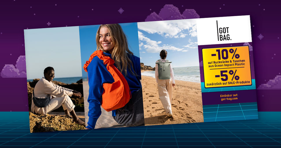 Doppelt sparen – mit Stil und Verantwortung: Bei GOT BAG gibt's Rucksäcke, Taschen u.v.m. aus recyceltem Ocean Impact Plastic und mit unserem Studentenrabatt aus dem neuen Gutscheinheft holst du dir 5% Nachlass auf den SALE!