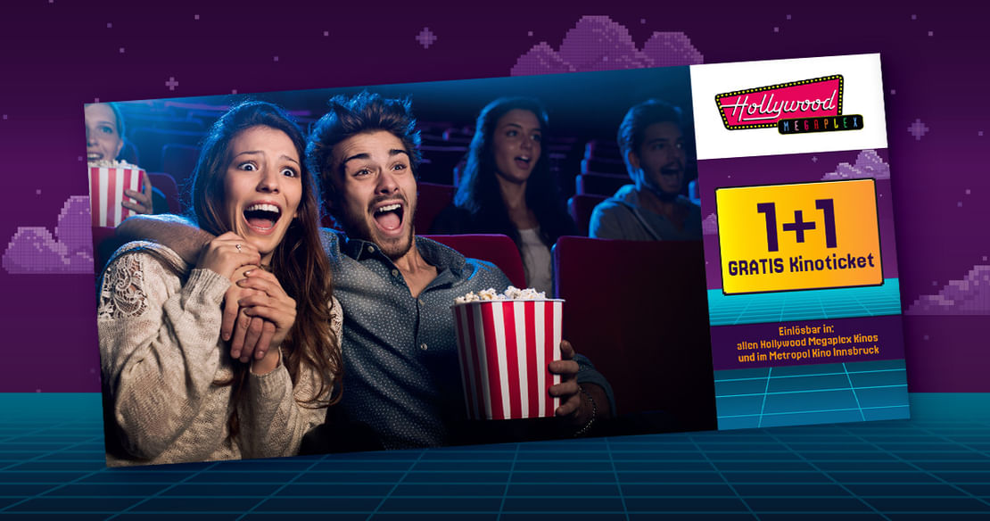Gültig bis zum 28.02.2026 und einlösbar in allen Hollywood Megaplex Kinos (Linz/PlusCity, St. Pölten, Wien Gasometer, Wien SCN) und im Metropol Kino Innsbruck. Nicht kombinierbar mit anderen Angeboten oder Gutscheinen.