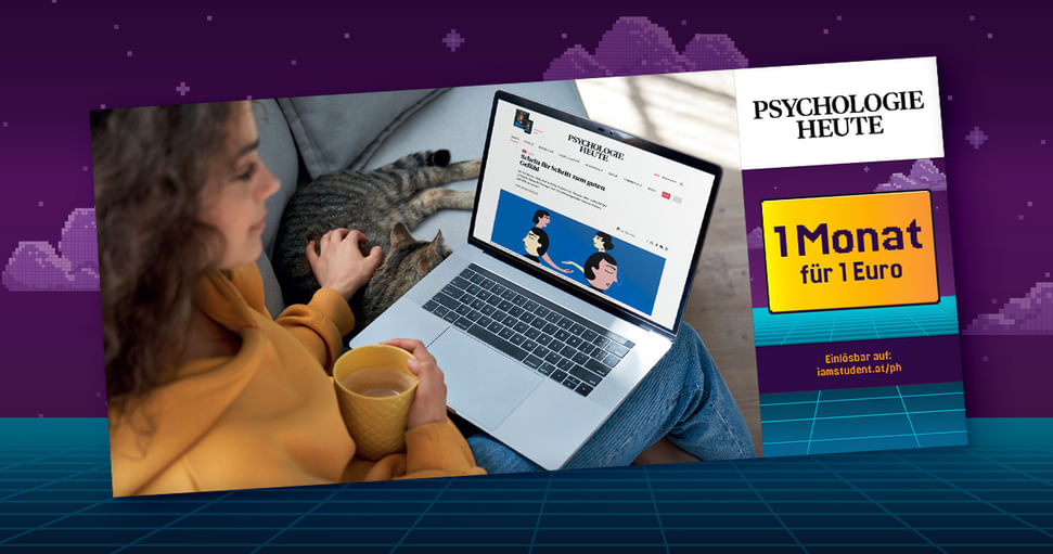 1€ ErsparnisMit PSYCHOLOGIE HEUTE hast du unbegrenzten Zugriff auf verständlich aufbereitetes Fachwissen aus der psychologischen Forschung und psychotherapeutischen Praxis. Nutze jetzt unsere Gutscheinheft-Aktion für die Mega-Ersparnis!
