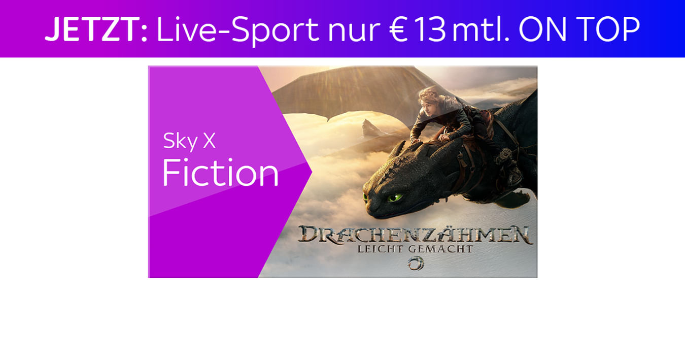 *Angebotspreis gilt für 12 Monate. Ab dem 13. Monat sind für Sky X Fiction 19,99€ mtl. zu entrichten. Angebot nur einmal buchbar. Mindestalter 18 Jahre. Monatlich kündbar, so dass das Abo jeweils mit Ablauf der monatlichen Rechnungsperiode beendet werden kann. Nicht mit anderen Sky X Aktionen oder Verträgen mit einer Mindestvertragslaufzeit von 12 Monaten kombinierbar. Die Ersparnis von 40% ergibt sich aus der Differenz des Aktionspreises von 12,00€ mtl. zum regulären Preis von 19,99€ mtl. Es gelten die AGB unter www.skyx.at/agb.