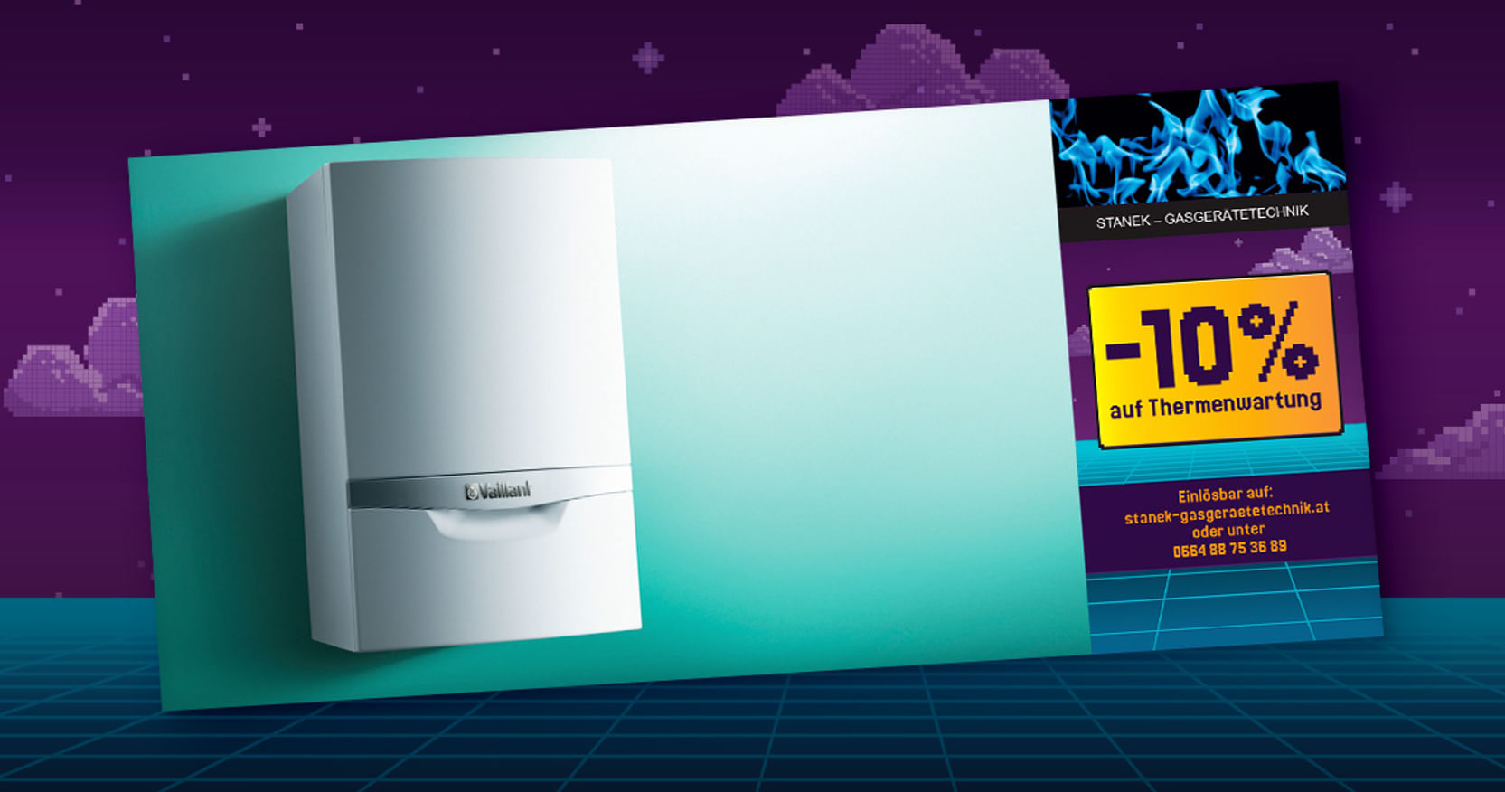 Dazu einfach auf www.stanek-gasgeraetetechnik.at gehen oder via Telefon (0664 88 75 36 89) eine Thermenwartung vereinbaren und diesen Gutschein bei der Thermenwartung vorzeigen.