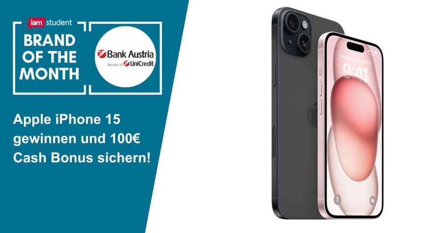 Die Bank Austria ist in Mega-Spendierlaune: Du bekommst nicht nur dein neues Studentenkonto mit 100€ Cash Bonus – obendrauf hast du auch noch die Chance auf ein brandneues iPhone 15!
